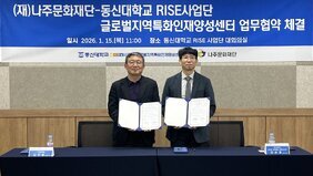 RISE사업 연계한 문화예술 협력 모델 구축 대학 인적 자원 활용해 문화산업 기반 강화 지역 문화자원을 기반으로 문화예술 향유를 넓히고 청년 인재 양성을 연계하는 협력 체계가 구축되면서 나주 지역 문화생태계에 새로운 활력이 기대되고 있다. 나주문화재단(이사장 윤병태)은 동신대학교 RISE사업단 글로벌지역특화인재양성센터(센터장 임순호)와 지난 15일 지역 문화예술 향유 확대와 문화산업 기반 조성, 청년 인재 양성을 위한 업무협약을 체결했다고 16일 밝혔다. 이번 협약은 지역 문화 자산을 매개로 문화재단과 지역대학이 협력해 상생 구조를 구축하는 것으로 지역 문화예술 발전과 지속 가능한 협력 모델을 마련했다는 점에서 의미가 있다. 양 기관은 협약을 통해 문화예술교육, 체험, 공연 등 다양한 문화 콘텐츠를 공동으로 발굴하고 지역 특성을 반영한 사업을 추진해 지속 가능한 지역 문화생태계 조성에 힘을 모으기로 했다. 특히 나주문화재단이 추진 중인 문화예술교육사업과 로컬브랜딩 사업에 동신대학교의 인적, 물적 자원을 연계해 관련 학과 학생들이 직접 참여하는 공동 기획 프로젝트를 운영할 계획이다. 관련 학과 학생과 지역 예술인이 함께 참여하는 사업 운영을 통해 청년 인재의 실무 역량을 강화하고 지역에 정착할 수 있는 협력 네트워크 구축도 기대된다. 양 기관은 이번 업무협약을 계기로 세부 실행계획을 수립한 뒤 오는 5월부터 공동 사업을 본격 추진할 예정이다. 김찬동 나주문화재단 대표이사는 “이번 협약은 재단과 대학, 지역 예술인이 함께 성장하는 구조를 만들어가는 출발점”이라며 “지역 문화예술의 가치 확산과 청년 인재 양성을 동시에 실현하는 협력 모델을 차근차근 구축해 나가겠다”고 말했다. 사진 설명) 나주문화재단과 동신대학교 RISE사업단이 지난 15일 지역 문화예술 및 청년 인재 양성을 위한 업무협약을 체결했다.